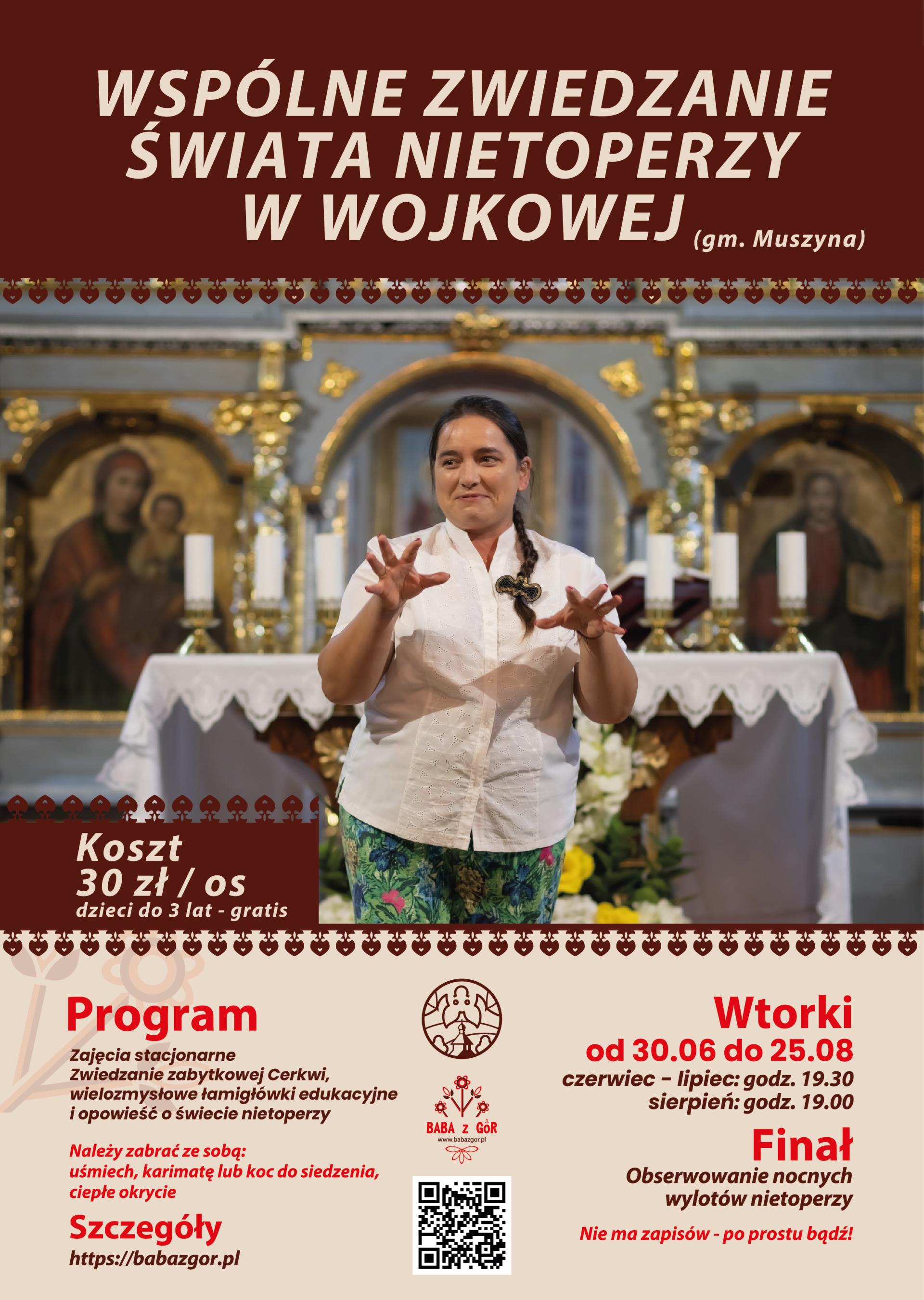 Serdecznie zapraszam na spotkanie w którym połączymy opowieści o ludziach, architekturze i przyrodzie w lekkiej wakacyjnej formie. Spotkanie rozpoczniemy od zwiedzania zabytkowej świątyni (dawnej cerkwi prawosławnej). Czas trwania zwiedzania: 15 minut (taki mi dzieci dają limit; mieszczę się w tym czasie!). Następnie przejdziemy na łąkę powyżej świątyni i przez około 45 minut będziemy w wakacyjnym klimacie edukacyjnym poznawać świat nietoperzy. Wspólnie rozwiążemy łamigłówki, zaśpiewamy piosenkę, założymy na czas spotkania nietoperzowe rekwizyty, poznamy pluszową drużynę nietoperzy i zostaniemy fanami podkowca małego. Finałem jest bezpieczna obserwacja nocnych wylotów nietoperzy (z poziomu kocyka na łące).